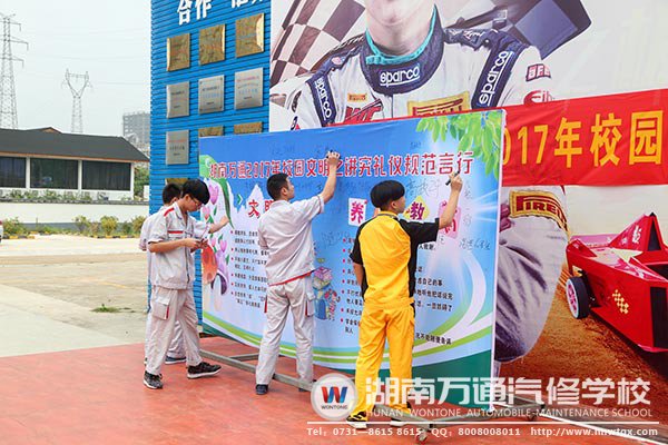 湖南万通汽修学校究礼仪规范言行文化精髓,以其为校园文化核心,全力铸造高技能、高素质全能型汽修精英人才。
